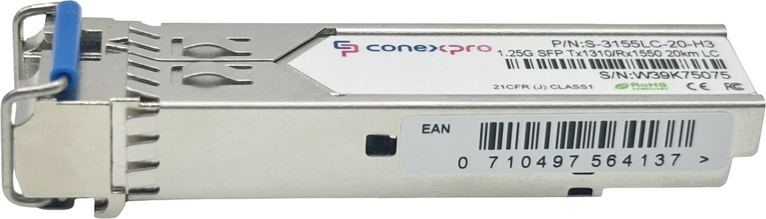 Gigabitový WDM/Bidi Singlemode SFP modul od výrobce Conexpro s vlnovou délkou (Tx/Rx) 1310/1550 nm, rychlostí 1 Gbps, vybavený jedním LC konektorem s UPC broušením a je určený pro spojení na vzdálenost až 20 km. Modul je speciálně upraven pro zajištění široké kompatibility, včetně plné podpory zařízení HP / H3C / 3Com a dalších značek dle MSA standardu. Samozřejmostí je podpora diagnostiky optického spoje pomocí funkce DDM (Digital Diagnostic Monitoring).