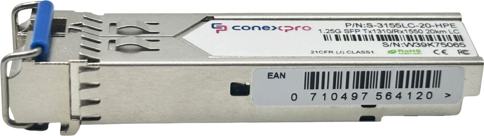Gigabitový WDM/Bidi Singlemode SFP modul od výrobce Conexpro s vlnovou délkou (Tx/Rx) 1310/1550 nm, rychlostí 1 Gbps, vybavený jedním LC konektorem s UPC broušením a je určený pro spojení na vzdálenost 20 km. Modul je speciálně upraven a je kompatibilní pouze se zařízeními HPE Aruba Networking ProCurve a dalších značek dle MSA standardu. Samozřejmostí je podpora diagnostiky optického spojení pomocí funkce DDM (Digital Diagnostic Monitoring).