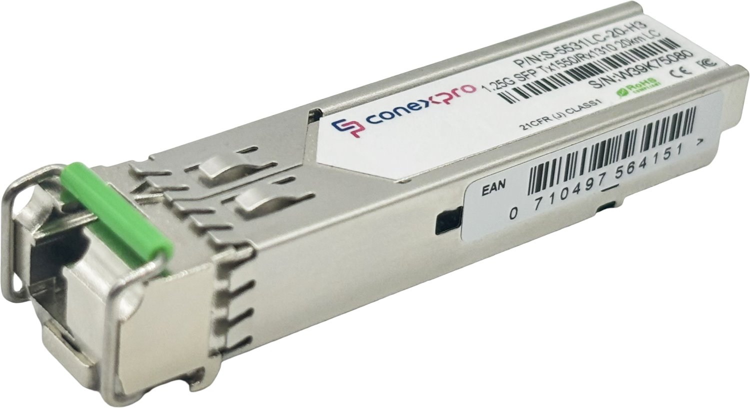 Gigabitový Singlemode SFP modul od výrobce Conexpro s vlnovou délkou (Tx i Rx) 1310 nm, rychlostí 1 Gbps , vybavený dvěma LC konektory s UPC broušením a je určený pro spojení na vzdálenost až 20 km . Modul je