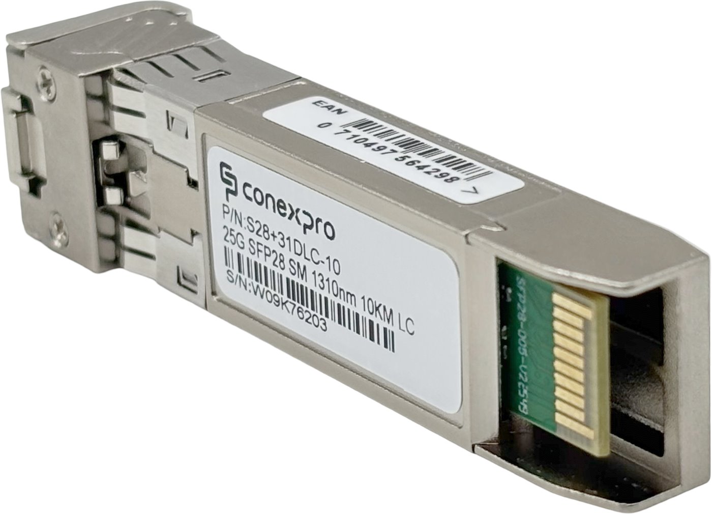 25Gigabitový SingleMode SFP28 modul od výrobce Conexpro s vlnovou délkou (Tx i Rx) 1310 nm, rychlostí 25 Gbps je vybavený dvěma LC konektory a je určený pro spojení na vzdálenost až 10 km. Tento modul poskytuje univerzální kompatibilitu, což znamená, že je schopen spolupracovat s téměř všemi dostupnými aktivními prvky. Samozřejmostí je podpora diagnostiky optického spojení pomocí funkce DDM (Digital Diagnostic Monitoring).