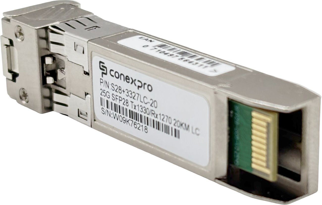 25-Gigabitový WDM/Bidi Singlemode SFP28 modul od výrobce Conexpro s vlnovou délkou (Tx/Rx) 1330/1270 nm, rychlostí 25 Gbps, vybavený jedním LC konektorem s UPC broušením a je určený pro spojení na vzdálenost 20 km. Tento modul poskytuje univerzální kompatibilitu, což znamená, že je schopen spolupracovat s téměř všemi dostupnými aktivními prvky. Samozřejmostí je podpora diagnostiky optického spojení pomocí funkce DDM (Digital Diagnostic Monitoring).