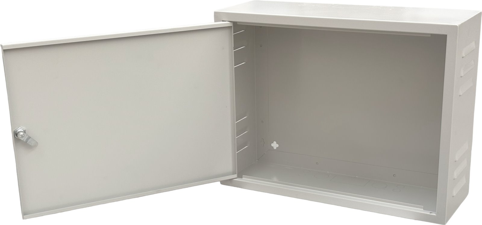 Skříň je vyrobena z pozinkovaného materiálu odolného proti zrezivění, s povrchovou úpravou v lesklé světle šedé barvě. Po odstranění vylamovacích krytek lze získat otvory pro vedení kabeláže na vrchní i spodní straně. Uchycení na zeď je řešeno pomocí 4 montážních otvorů na zadní straně skříně. Skříň lze namontovat pro otevírání dveří na levou či pravou stranu.