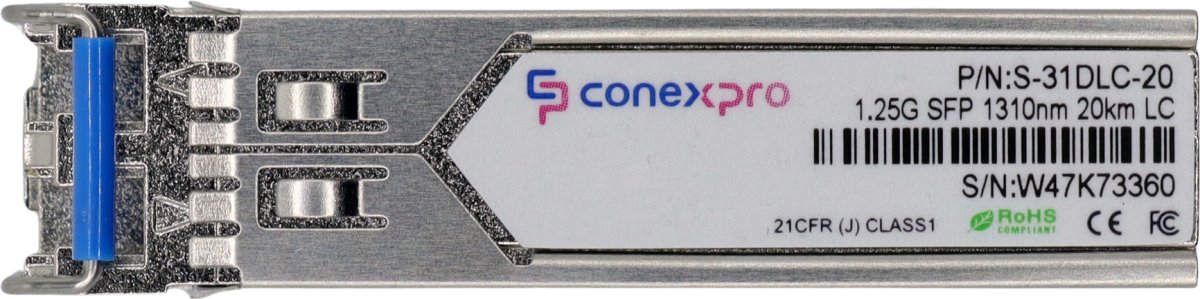 Gigabitový Singlemode SFP modul od výrobce Conexpro s vlnovou délkou (Tx i Rx) 1310 nm, rychlostí 1 Gbps , vybavený dvěma LC konektory s UPC broušením a je určený pro spojení na vzdálenost až 20 km . Modul je