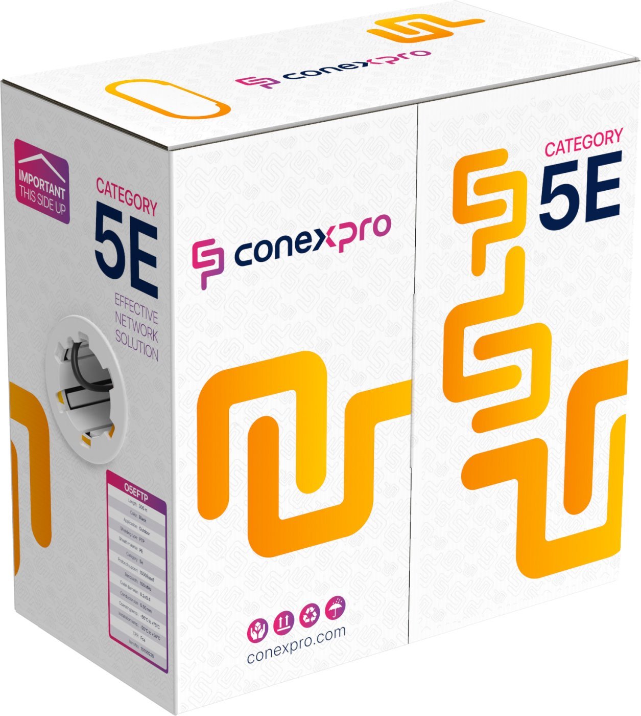FTP kabel kategorie 5e značky Conexpro je navržen pro venkovní rozvody strukturované kabeláže a bez problémů splňuje mezinárodní standardy včetně všech aktuálních dodatků. Kabel umožňuje přenos dat rychlostí až 1 Gbps (1000 Base-T). Plášť má černou barvu, je vyroben z PE materiálu, se stíněním a uzemňovacím drátem pro připevnění ke konektoru s očkem. Vodiče jsou z kvalitního měděného drátu o průřezu AWG24. Kabel je balen do kvalitní kartonové krabice s moderním designem a je označen po každém metru od 0 do 305 m.